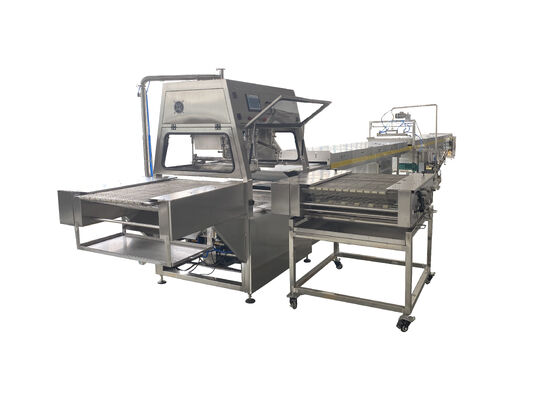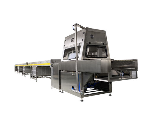 この生産ラインはダークチョコレート,ミルクチョコレート,複合チョコレートをサポートし,光沢のある高品質な仕上げを達成するためにオプションの磨きと冷却システムを備えています.